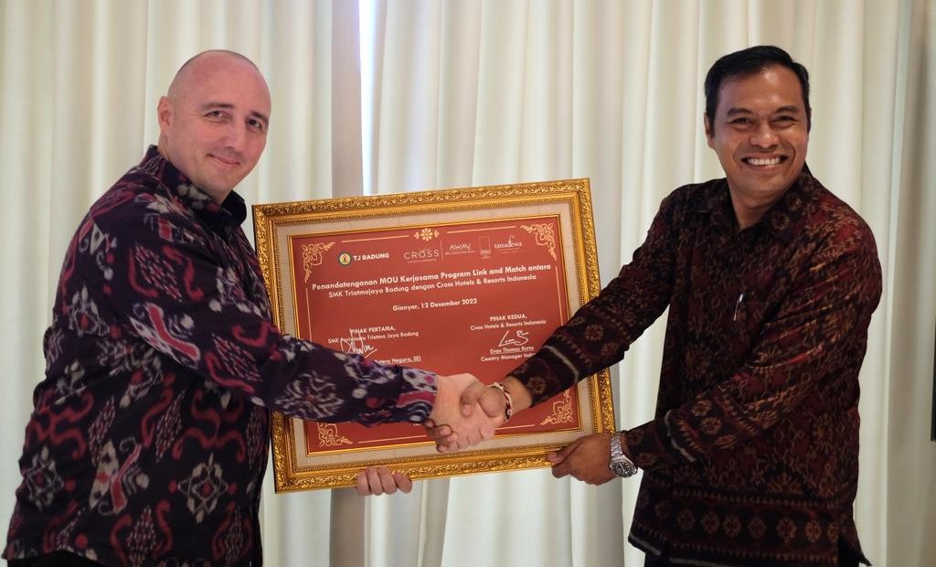 Hal tersebutlah disampaikan Evan Burns selaku Country Manager Cross Hotels and Resorts Indonesia dalam acara Penandatanganan MOU Kerjasama Program Link and Match antara SMK Triatmajaya Badung dengan Cross Hotels and Resorts Indonesia, Senin, 12 Desember 2022 bertempat di Tanadewa Resort & Spa Ubud by Cross Collection.