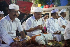 Walikota Denpasar, IB Rai Dharmawijaya Mantra saat hadir mengikuti Upacara Puja Brahmantaka Utpatya Nunas Kasidian Pangelukatan Penyapuhan Upadarwa Maring Ida Bhatara Sakti Sang Hyang Dwijendra Siwa Ludra Ring Pura Luhur Uluwatu, Sabtu Malam (8/2) di Pura Luhur Uluwatu, Desa Adat Pecatu.