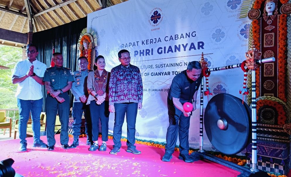 Pembukaan Rakercab PHRI Gianyar ditandai dengan pemukulan Gong oleh Kadis Pariwisata Gianyar, didampingi Ketua PHRI Gianyar dan Camat Tegallalang. (LB/Ari)