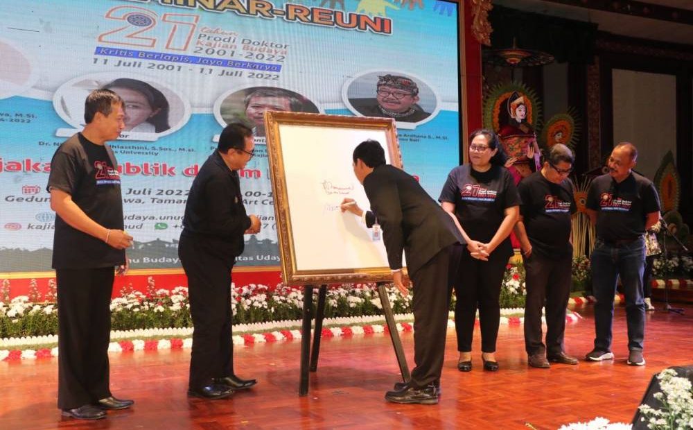 DENPASAR, lintasbali.com – Program Studi Doktor (S3) Kajian Budaya FIB Unud menyelenggarakan Seminar “Kebijakan Publik dalam Kajian Budaya” yang dirangkaikan dengan Reuni dalam rangka perayaan HUT ke-21 bertempat di Gedung Ksirarnawa Taman Budaya Art Centre Provinsi Bali, Senin (18/07/2022). Seminar ini menghadirkan dua pembicara yakni Prof. Dr. Tjok Oka Artha Ardhana Sukawati, M.Si (Wakil Gubernur Bali) dan Prof. Dr. I Nengah Dasi Astawa, M.Si (Kepala LLDIKTI Wilayah VIII periode 2014-2022) dengan moderator Dr. Ni Wayan Widhiasthini, S.Sos.,M.Si dari Undiknas. Kesemuanya merupakan alumni dari Program Studi S3 Kajian Budaya. Perayaan HUT ini turut dihadiri oleh Rektor Unud, Dekan dan Ketua Senat FIB, Koorprodi, Ketua Ikayana, serta Dosen, Guru Besar, Alumni dan mahasiswa Prodi S3 Kajian Budaya.  Tema yang diusung dalam Peringatan HUT Ke- 21 Prodi S3 Kajian Budaya “Kritis Berlapis, Jaya Berkarya”.