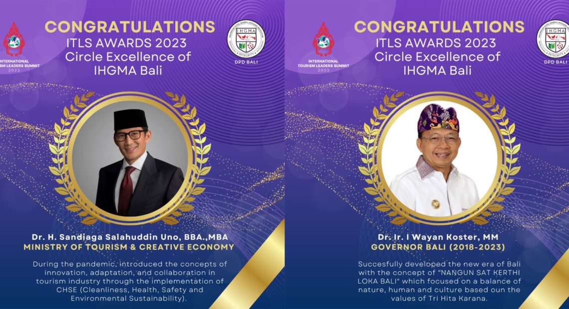 Menteri Pariwisata & Ekonomi Kreatif RI, Dr. Sandiaga Salahuddin Uno, B.B.A., M.B.A. menerima apresiasi dan penghargaan ITLS Awards 2023 – Circle Excellence IHGMA Bali atas dukungan penuhnya dalam membangkitkan Pariwisata Bali sejak diterjang Covid-19 dan dukungan yang luar biasa dalam akselerasi pemulihan hingga saat ini Pariwisata Bali sudah kembali normal.