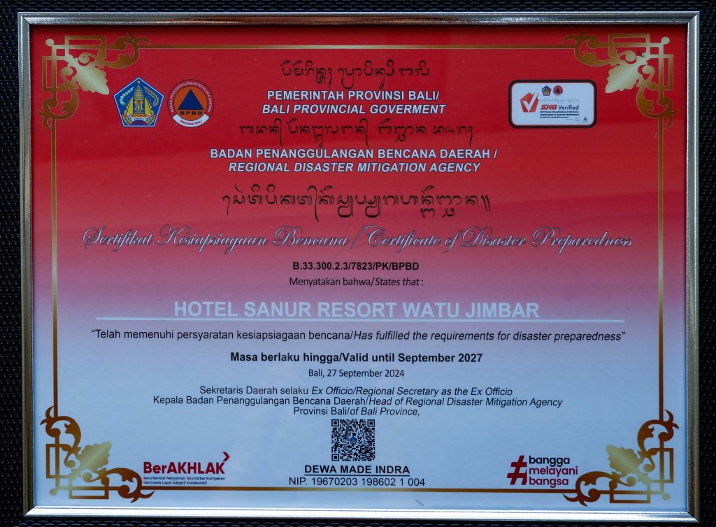 DENPASAR, lintasbali.com – Sanur Resort Watujimbar telah memperoleh Sertifikat Kesiapsiagaan Bencana bagi Dunia Usaha Pariwisata yang di kenal dengan Si Kencana Duta Bali yang merupakan program berkelanjutan bebas biaya oleh Badan Penanggulangan Bencana Daerah (BPBD) Provinsi Bali.