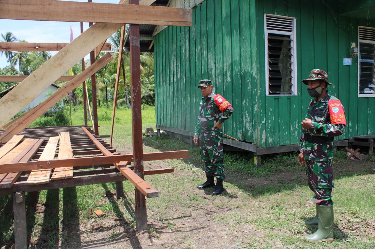 20 pasukan dibantu warga setempat bekerja sama memasang puing – puing papan yang menjadi bahan dasar. Kali ini, pihaknya membuat pagar untuk jembatan.