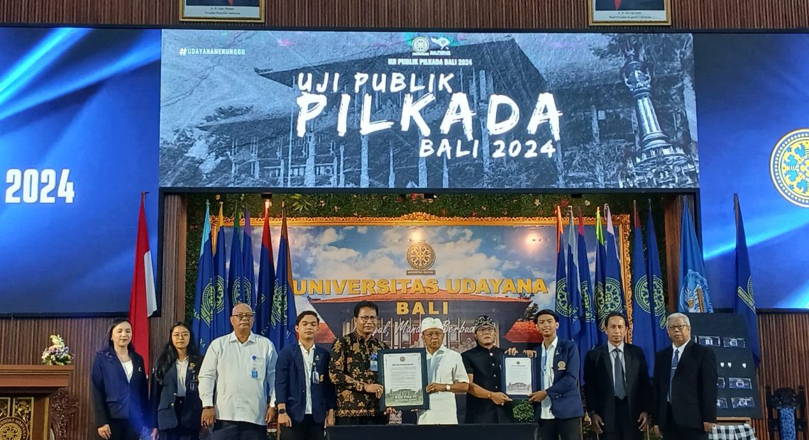 Kegiatan Uji Publik Pilkada Bali 2024 diinisiasi BEM Unud dan didukung penuh Rektorat Unud. Wakil Rektor IV Bidang Perencanaan Kerjasama dan Informasi Unud Prof. Dr. dr. I Putu Gede Adiatmika, M.Kes mewakili rektor membuka kegiatan ini. Bertindak sebagai Moderator, Dr. Kadek Dwita Apriani, S.Sos, M.I.P. Tiga panelis yakni Prof Suka Arjaya, Prof I Wayan Suarna, dan Ketua BEM Unud I Wayan Tresna Suwardiana. (Red/Rls).