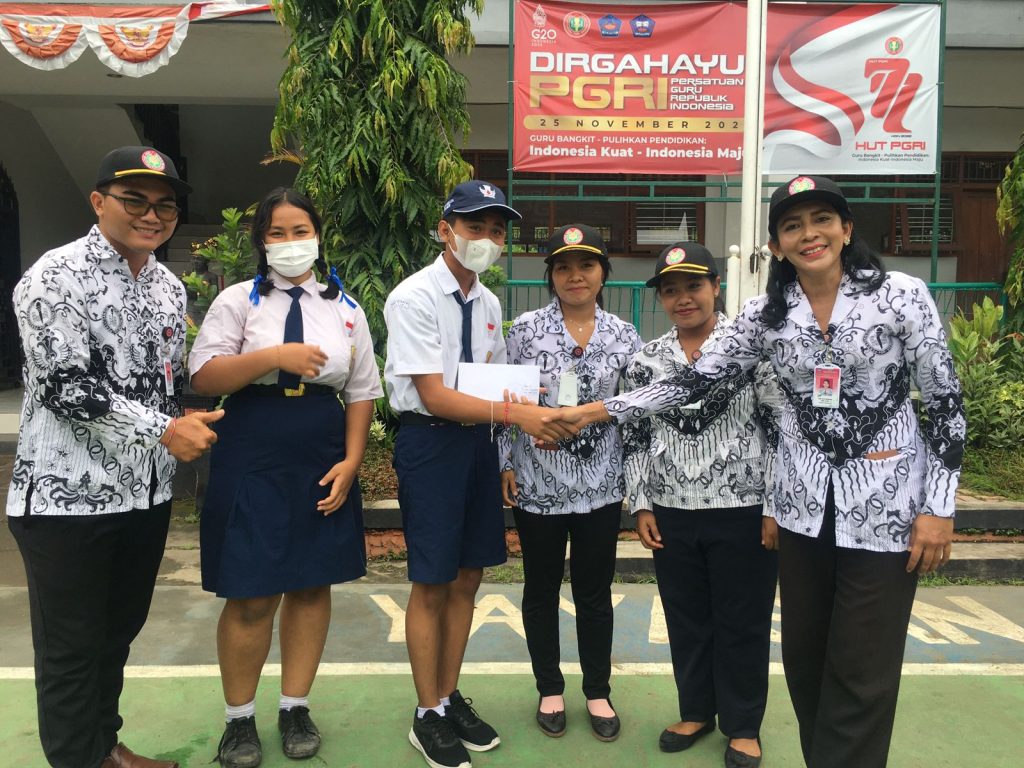 Penyerahan hadiah oleh Kepala SMP Wisata Sanur kepada pemenang lomba rangkaian Hari Guru Nasional tahun 2022 dan HUT PGRI ke-77