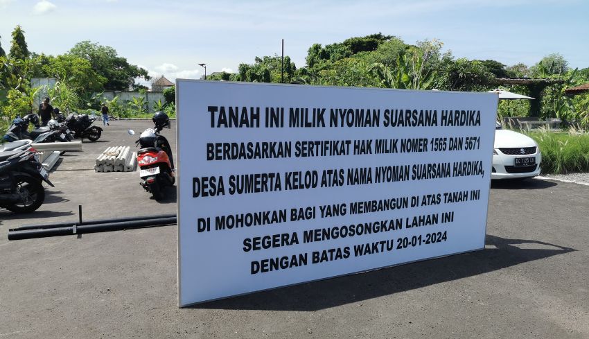 Plang peringatan dari Nyoman Suarsana Hardika yang di pasang di lahan miliknya di kawasan Jalan Badak Agung Denpasar