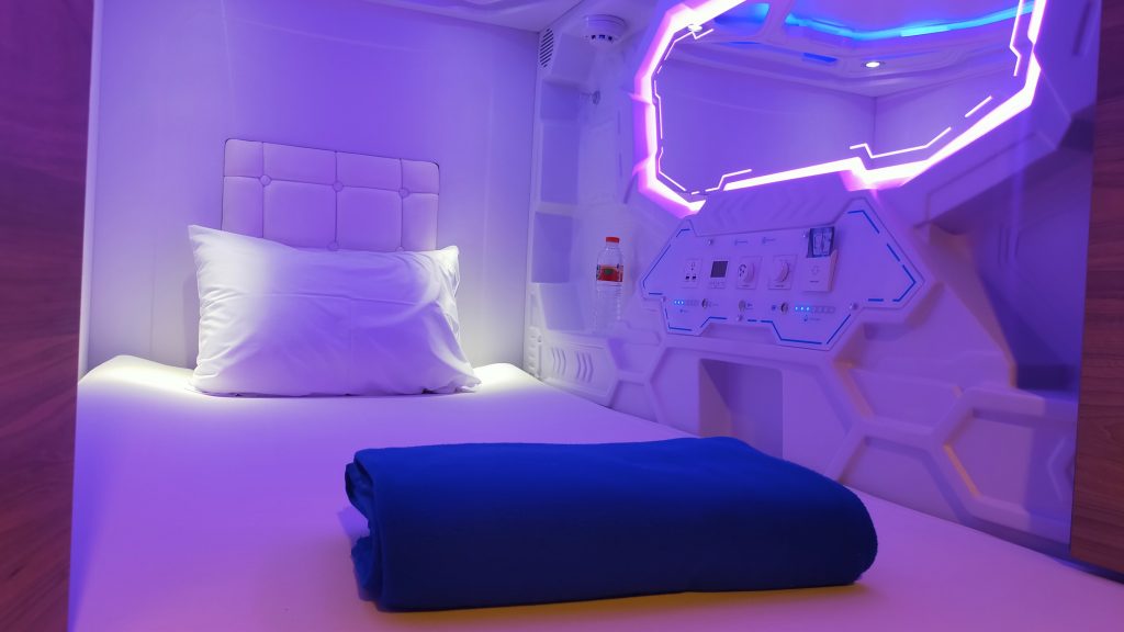 Disetiap pod terdapat Bluetooth speaker, lampu suasana yang bisa diubah-ubah warnanya, kasur dan bantal berkualitas tinggi, selimut, tempat penyimpanan tas, system ventilasi udara.