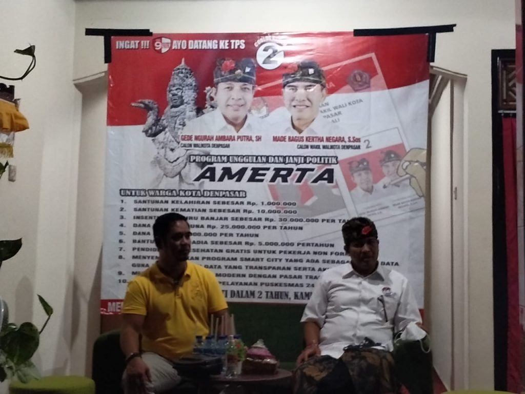 Denpasar, Lintasbali.com : Pasangan Calon (Paslon) Walikota dan Wakil Walikota Denpasar nomor urut 2, Gede Ngurah Ambara Putra dan Made Bagus Kertha Negara (AMERTA) kembali melaksanakan Simakrama. Kali ini Paslon AMERTA menemui relawan dan pendukungnya di Desa Pemogan, Jl. Bedugul Putih Gang Baler Griya No. 10 Pemogan Denpasar Selatan, (22/11).