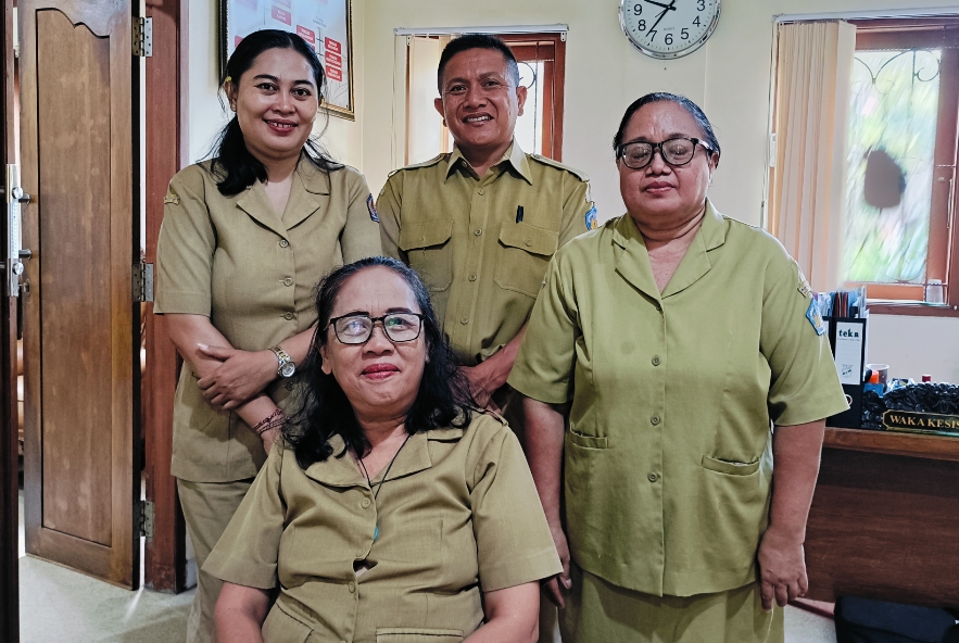 Dra. Cokorde Istri Mirah Kusuma Widiawati, M.Sos (duduk depan) Kepala SMA Negeri 5 Denpasar didampingi Wakasek dan salah satu Guru saat diwawancarai soal prestasi di ajang Karya Tulis Ilmiah di Universitas Tidar Magelang.