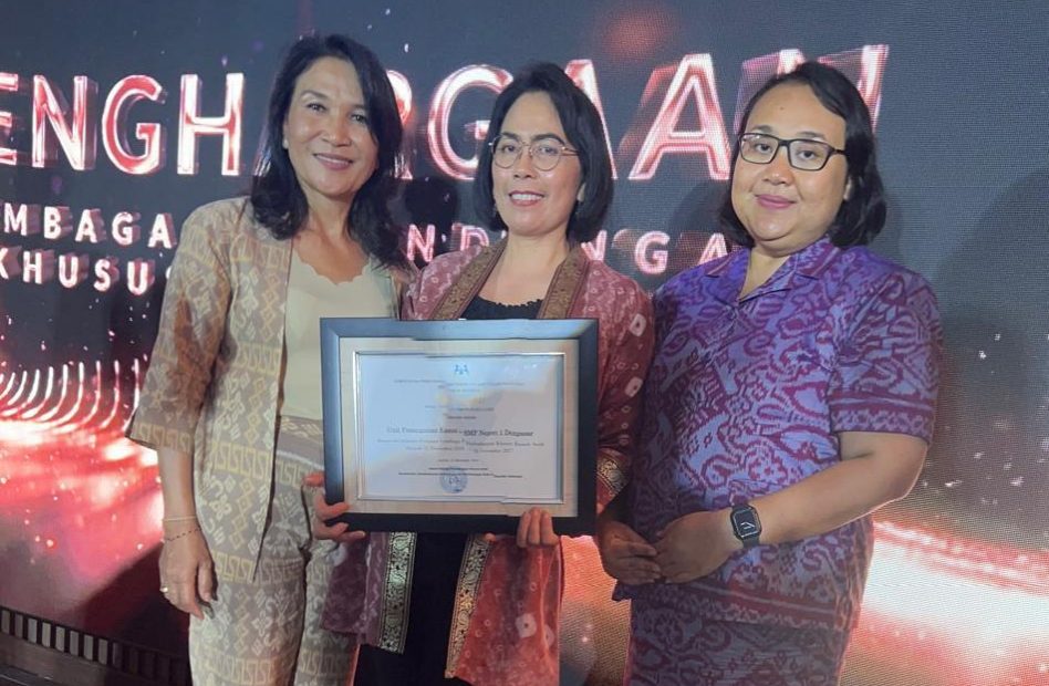 Penghargaan diterima oleh perwakilan SMPN 1 Denpasar, didampingi oleh Dinas Pemberdayaan Perempuan Dan Perlindungan Anak, Pengendalian Penduduk Dan Keluarga Berencana (P3AP2KB) Kota Denpasar dan Dinas Sosial Provinsi Bali.