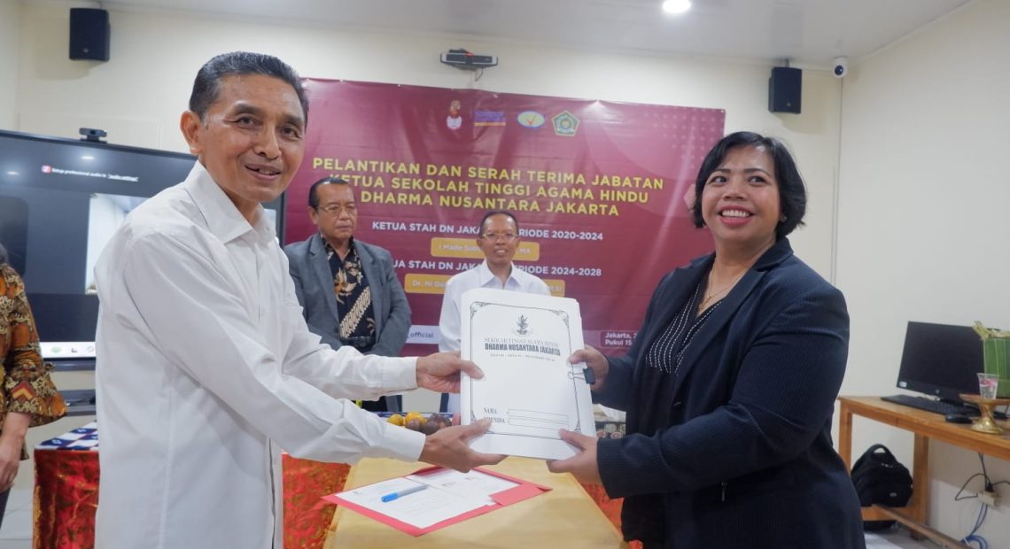 Serah terima jabatan dari ketua sebelumnya, Made Sutresna, S.Ag., M.A., berlangsung hari ini di Kampus STAH Dharma Nusantara Jakarta, Jatiwaringin, Jakarta Timur. Acara ini dihadiri oleh Dirjen Bimas Hindu Kemenag RI, Prof. Dr. Drs. I Nengah Duija, M.Si., Sekretaris Ditjen Bimas Hindu, Dr. Ida Made Pidada Manuaba, Direktur Pendidikan Hindu Kemenag, Dr. Trimo (via Zoom), pendiri STAH Dharma Nusantara Jakarta, Bapak Dewa Suratnaya, serta seluruh jajaran Senat, dosen, mahasiswa, alumni, dan stakeholder kampus.