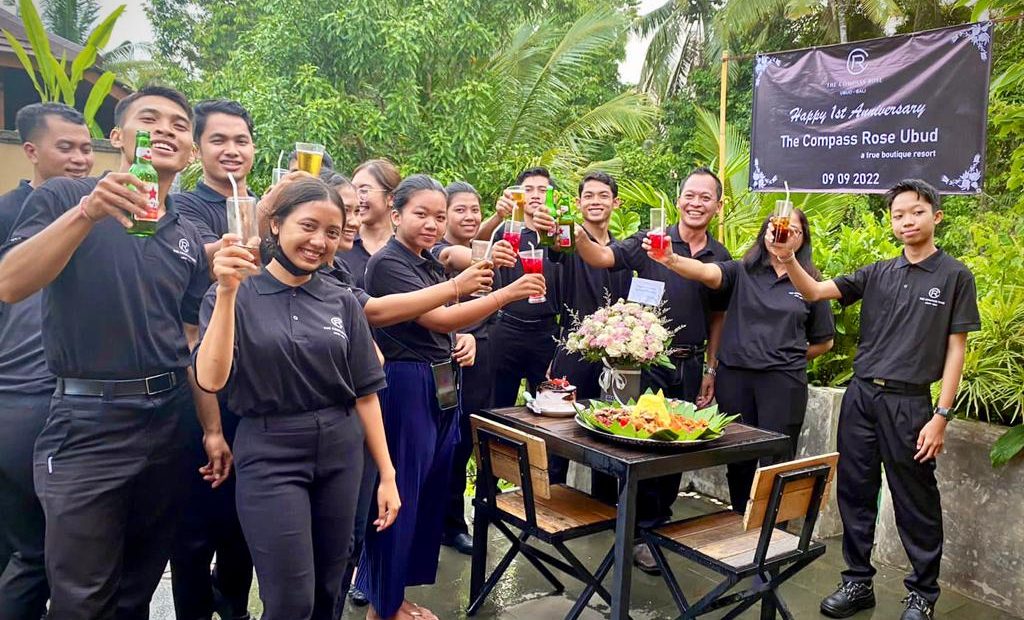 GIANYAR, lintasbali.com – Tangguh berjuang selama pandemi, The Compass Rose Ubud, sebuah Boutique Resort di Desa Petulu, Gianyar, merayakan hari jadinya yang pertama pada Jumat, 9 September 2022. Perayaan setahun berdirinya The Compass Rose Ubud dilaksanakan secara sederhana dan kekeluargaan dengan pemotongan tumpeng.