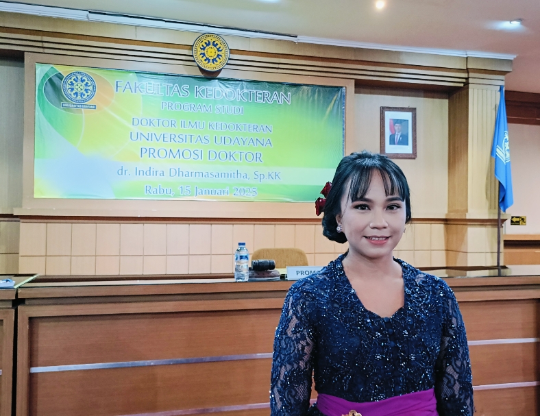 Dengan menyandang gelar Doktor, dr. Indira Dharmasamitha, Sp.KK sekaligus menjadi Doktor Pertama dengan metode riset dan menjadi Doktor Termuda dan Tercepat dari Fakultas Kedokteran, Program Studi Doktor Ilmu Kedokteran, Universitas Udayana. (LB/Ari)