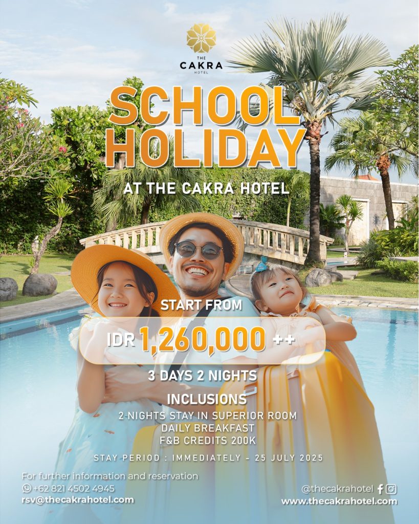 DENPASAR, lintasbali.com – Momen liburan sekolah adalah waktu yang tepat untuk mempererat kebersamaan keluarga, dan The Cakra Hotel siap menjadi destinasi ideal untuk staycation yang menyenangkan. Dengan penawaran menginap selama 3 hari 2 malam di Superior Room, mulai dari Rp1.260.000, Anda sudah dapat menikmati sarapan untuk dua orang, food & beverage credit sebesar Rp 200.000 selama masa menginap, serta akses ke beragam fasilitas hotel yang menunjang kenyamanan dan keseruan liburan.