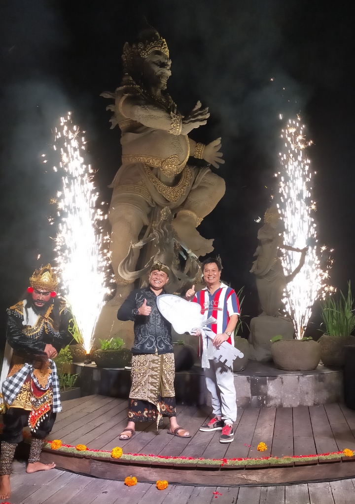 Putu Suryawan (kanan), Owner The Kayon Hotels & Resorts saat menyerahkan kunci kepada Wayan Sucitra (kiri), CEO The Kayon Hotels & Resort sebagai tanda mulai beroperasi The Kayon Valley Resort Ubud pada Kamis, 11 Mei 2023