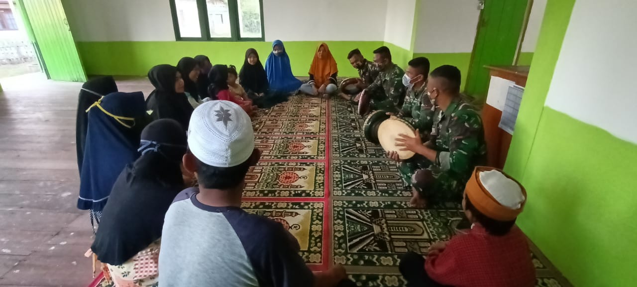 Anggota Satgas TMMD mendampingi jema’ah mushola Al Hidayah untuk memainkan irama musik rebana, melantunkan syair-syair Islami yang mengandung pujian keagungan Allah SWT dan keteladanan Nabi Muhamad SAW. (Rls)