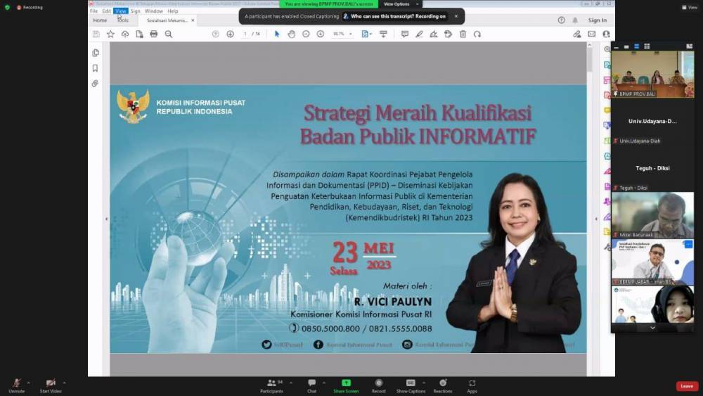 Kegiatan yang juga berlangsung secara hybrid melalui aplikasi zoom meeting ini diikuti oleh PPID Satuan Kerja di lingkungan Kemendikbudristek, PTN dan Vokasi dengan menghadirkan narasumber dari Komisi Informasi Pusat dan Biro Umum & PBJ Kemendikbudristek.