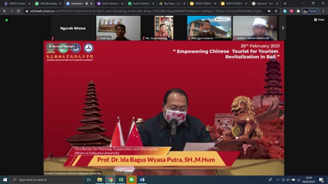 DENPASAR, lintasbali.com – Dalam rangka memperingati Imlek tahun 2021, Universitas Udayana melalui Tourism Confucius Institute menggelar International Webinar dengan tema “Empowering Chinese Tourists for Tourism Revitalization in Bali” atau “Memberdayakan Wisatawan Tiongkok untuk Revitalisasi Pariwisata di Bali”, Jumat (26/2/2021).