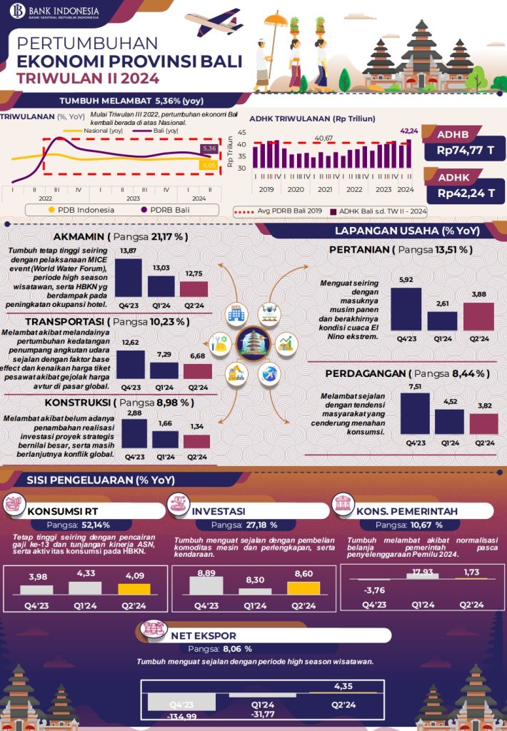 DENPASAR, lintasbali.com – Rilis Badan Pusat Statistik (BPS) menggambarkan ekonomi Bali triwulan II – 2024 tumbuh sebesar 5,36% (yoy), melambat dibandingkan triwulan sebelumnya yang mencapai 5,98% (yoy). Meski melambat, pertumbuhan ekonomi Bali triwulan II – 2024 terpantau lebih tinggi dari ekonomi nasional yang tumbuh sebesar 5,05% (yoy) dan menempati peringkat 7 (tujuh) dari 34 Provinsi di Indonesia.