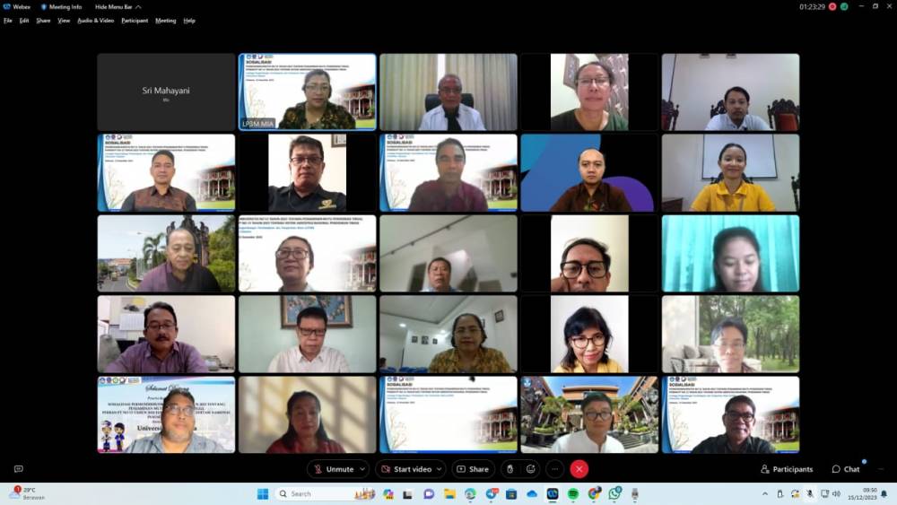 DENPASAR, lintasbali.com – Wakil Rektor Bidang Akademik Universitas Udayana Professor Rai Maya Temaja memberi sambutan sekaligus membuka acara Sosialisasi Permendikbudristek No 53 Tahun 2023 Tentang Penjaminan Mutu Pendidikan Tinggi, Perban PT No 13 Tahun 2023 Tentang Sistem Akreditasi Nasional Pendidikan Tinggi, yang diselenggarakan pada Jumat, 15 Desember 2023 secara Daring melalui Aplikasi Webex oleh Lembaga Pengembangan, Pembelajaran, dan Penjaminan Mutu (LP3M) Universitas Udayana.