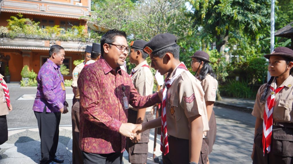 DENPASAR, LintasBali.com – Wakil Walikota Denpasar, Kadek Agus Arya Wibawa yang juga Ketua Kwartir Cabang (Kwarcab) Pramuka Kota Denpasar melepas Kontingen Kwarcab Pramuka Kota Denpasar yang akan mengikuti Lomba Tingkat Regu Pramuka Penggalang Empat (LT-IV) Kwartir Cabang Gerakan Pramuka Denpasar Tahun 2023. Pelepasan kontingen dilaksanakan di halaman Kantor Walikota Denpasar, Selasa, 28 Maret 2023. Total sebanyak 16 peserta LT-IV dilepas secara langsung Wawali Arya Wibawa ditandai dengan simbolisasi Pengenaan Scraft.
