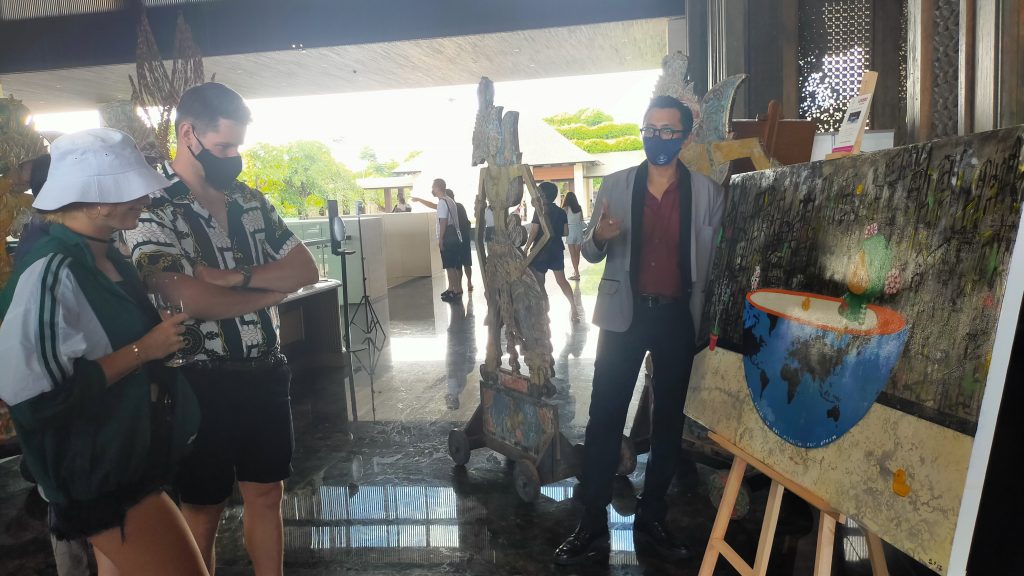 MANGUPURA, lintasbali.com – Menarik dan menjadi perhatian turis. Karya-karya seni lukis analog dan digital yang dipamerkan Whoa!Frank di Pendopo Lobby Apurva Kempinski Bali menjadi daya tarik bagi wisatawan yang berkunjung di hotel tersebut.